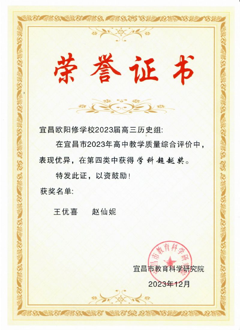 在宜昌市2023年高中教學(xué)質(zhì)量綜合評(píng)價(jià)中,我校高三歷史教研組表現(xiàn)優(yōu)異,榮獲同類(lèi)學(xué)校一等獎(jiǎng)和學(xué)科超越獎(jiǎng)。