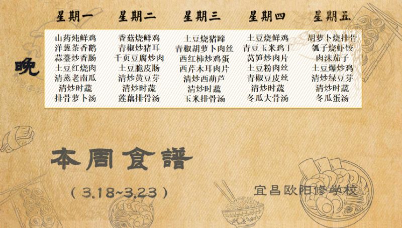 宜昌歐陽修學校每周食譜(3月18日至3月23日)