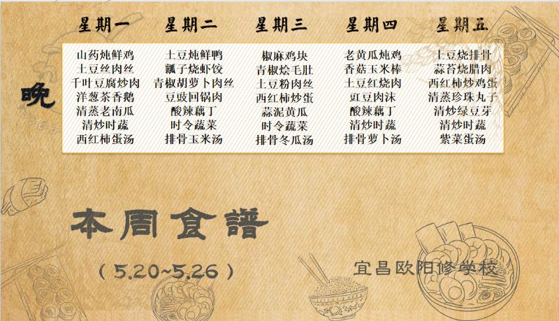 宜昌歐陽修學(xué)校每周食譜(5月20日至5月26日)