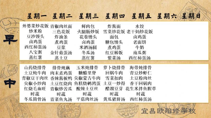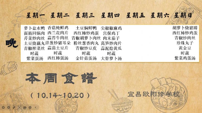 宜昌歐陽修學校每周食譜(10月14日至10月20日)