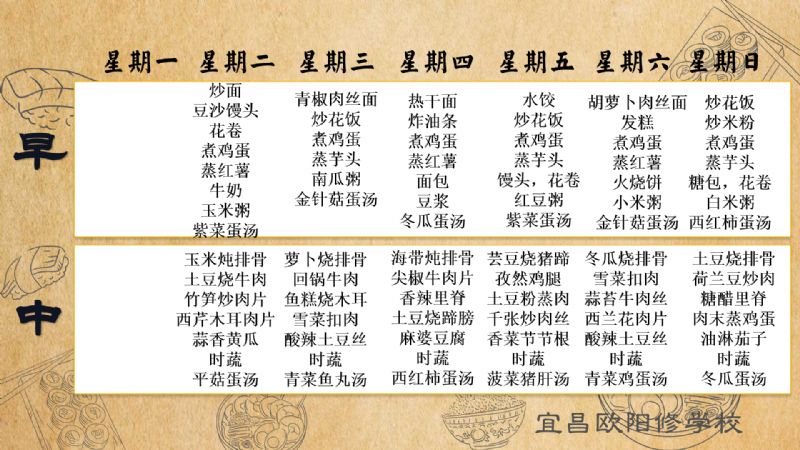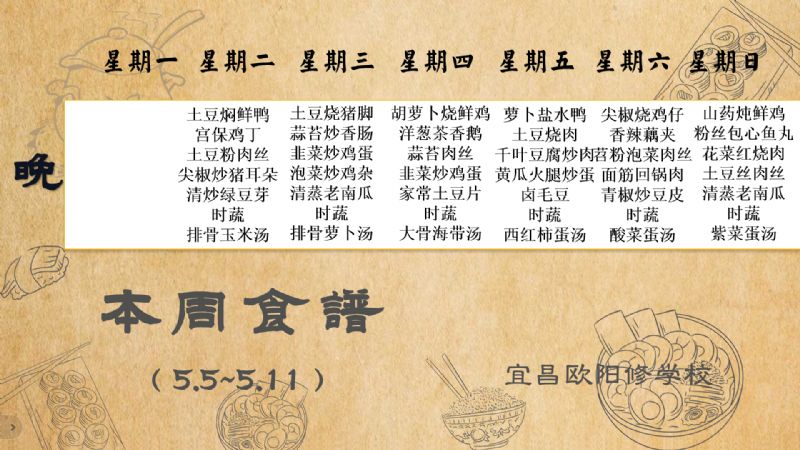 宜昌歐陽修學校每周食譜(5月5日至5月11日)